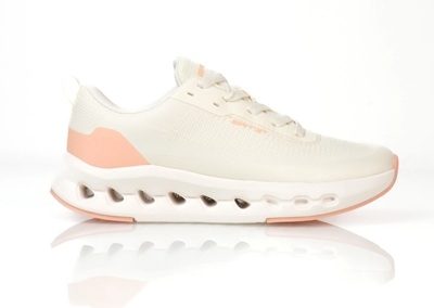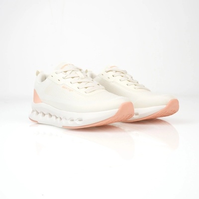 Megjelenésében a letisztult fehér és finom barackszín kombinációja nőies, mégis sportosan lendületes hatást kelt. A fehér fűző harmonikusan illeszkedik az összképbe, míg a cipő dinamikus vonalvezetése modern, energikus karaktert ad.