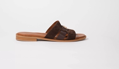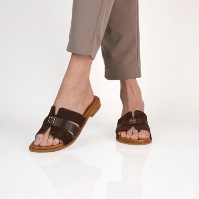 Ez a lábbeli egy igazi aduász minden nő számára. Sötétbarna árnyalatának köszönhetően remekül kombinálható bármilyen színvilággal. A bársonyosan puha bőr felsőrészt egy ízléses fém dísszel is elláttuk, hogy igazán stílusos viseletet nyújtson. A puha, bőr bevonatú lábágy anatómiai kialakítása garantálja a kényelmet a hosszú nyári napokon, legyen szó városi sétáról vagy tengerparti pihenésről.