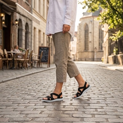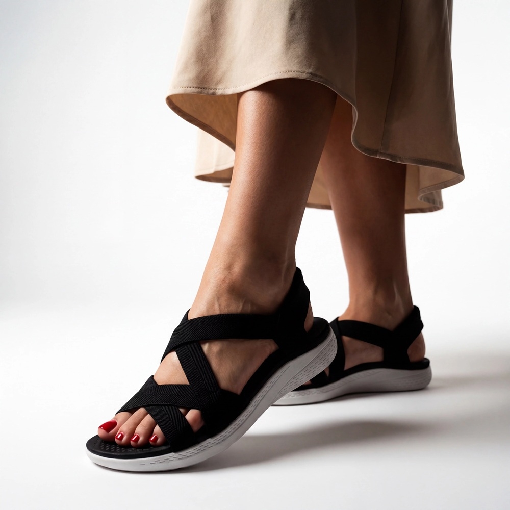 A könnyen felvehető kialakításnak köszönhetően egyszerűen csak belelépsz – nem kell lehajolni, nem kell kézzel igazítani. A rugalmas, gumis felsőrész finoman alkalmazkodik a lábfejhez, így stabil tartást ad anélkül, hogy szorítana.
